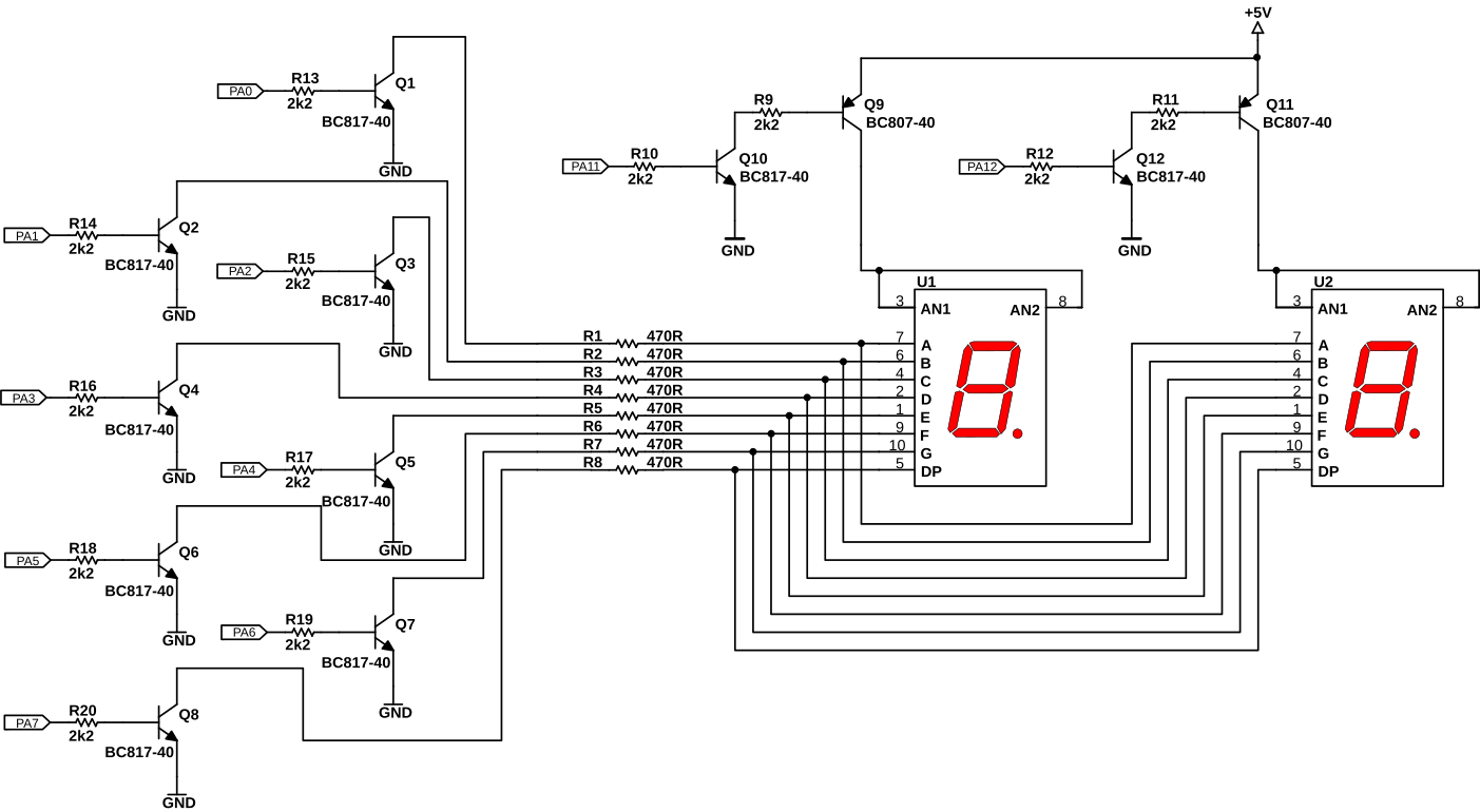 In this circuit, the idea is to drive both displays with only 8 microcontroller pins for the segments, and two microcontroller pins for control. This is called multiplexing. It works by switching the first display on using microcontroller pin PA11 that drives transistors Q10 and Q9. With power switched on the anode pins of the first display, the desired segments are switched on using microcontroller pins PA0 to PA7, to display the desired number or digit. The desired digit is displayed for a certain time, and then power to the display is switched off.